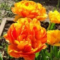 Конечно же, нет! Это не пион, а огромный густомахровый тюльпан Дабл Бьюти оф Апельдорн. Почему же его так легко спутать с пионом? Да потому что его крупный бутон имеет не шесть лепестков, а намного больше. Слегка волнистые чашеобразные лепестки цветка просто удивляют своим окрасом! На одной клумбе встречаются и чисто желтые, и желто-красные, и почти красные цветки.