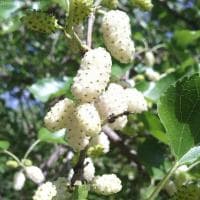Белая шелковица действительно отличается от черной цветом, но не плодов, а коры, которая у этого вида намного светлее. Ягоды, появляющиеся на белой шелковице, могут быть не только белыми, но и розовыми, фиолетовыми и даже черными. Они менее ароматные, но более сладкие и доступные, так как белая шелковица морозоустойчива и может быть выращена даже в прохладных климатических условиях. Соплодия — многокостянки, длиной до 4 см, цилиндрические, белые или окрашены в розовый или красный цвет. Вкус супер сладкий. Период созревания плода приходится на июнь-июль. Масса плода - 4,5 гр.